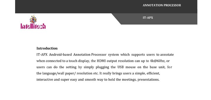 Intellitech Global was founded in 2003 and has 12 years of professional manufacturing and selling experience. After years of persistent efforts contributed by the whole team, now Intellitech has formed a comprehensive management system that integrates R & D, solution design, manufacturing as well as domestic and international sales. The main products include Data video wall controller, Digital Visualizer, Quad view, Interactive Whiteboard, Portable Scanners, Projector (ultra short throw and short throw), Multimedia Controller and LCD Touch Screen.